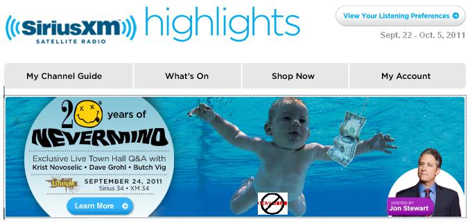 In their September Highlights email to subscribers Sirius XM features an uncensored image of the album cover prominently in the banner. The banner is an advertisement for the special Nirvana coverage, but I found it interesting that given all of the attention that Nirvana is getting about this subject (even 20 years later) that Sirius XM would send out such an email. Ironically on their website Sirius XM crops off the baby’s genitalia and uses the photo that I have used in this article.