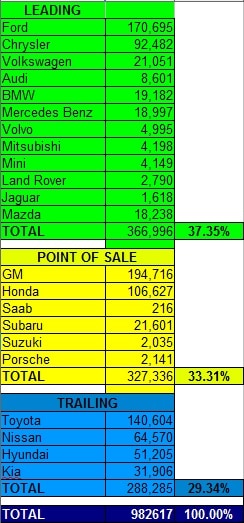 Right now the OEMs that are having the most success are the “LEADING” category. Fords strong sales measured against the drop in sales experienced by Toyota and Nissan have caused a shift to the Leading category. The leading category is making up just over 37%, while the “TRAILING” category has shifted to below 30%. The key thing to understand is that it is likely that a lot of the “LEADING” category sales were already being counted as subscribers last quarter. This is not a bad thing, but understanding it is important, as knowing how the OEM channel impacts satellite radio keeps investors expectations in line with what is happening in the sector. Of the categories offered, the “LEADING” category has the #2 and #4 position in sales volume for June. The #1 position and #3 position are from the “POINT OF SALE” category, while the “TRAILING” category has the 5th position.